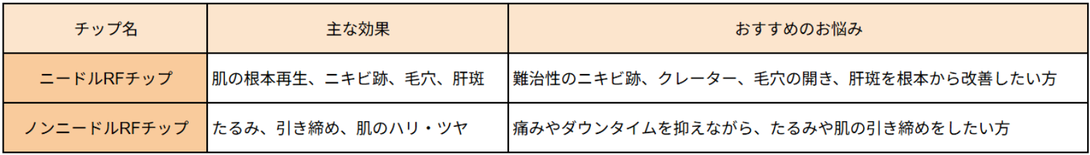 ニードルRFチップとノンニードルRFチップの2種類があり、それぞれが全く異なるアプローチで肌の改善を図ります。